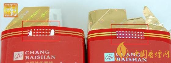 如圖一、圖二白色框標(biāo)注所示,真煙外包裝采用專用紙張印刷,條包和小包圖案及文字顏色一致,顏色光亮、鮮艷,字跡清晰、完整,表面著色均勻、富有光澤,"長白山"三字凸感明顯。假煙商標(biāo)圖案印刷粗糙、不清晰,文字有偏色、燙金色澤黯淡,字跡不清,表面著色不均,光澤差且模壓圖案或文字凸感不夠。真煙煙盒表面有明顯的豎條紋,假煙則沒有。