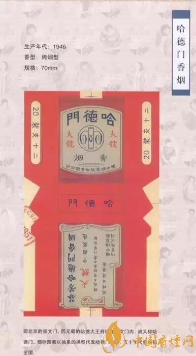 作為早期的洋煙商標(biāo)之一,“哈德門”商標(biāo)是當(dāng)時大英煙草公司于1919年注冊的。后來通過英美煙草公司在中國建廠制造,“哈德門”成為二十世紀(jì)二三十年代家喻戶曉的著名香煙品牌。由于煙標(biāo)構(gòu)思新穎,色調(diào)幽雅清新,吸食甘涼清香,因此很受煙民的歡迎。