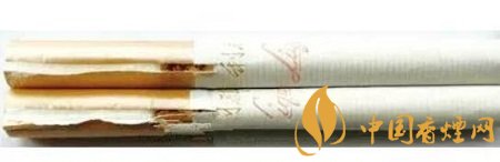 真品商標(biāo)紙采用噴鋁紙凹印印刷,“過濾嘴香煙”字體筆畫較粗且粗細(xì)均勻,金黃色警示語(yǔ)分割線較粗且立體感強(qiáng),用手摸凹凸感明顯;假煙采用高清掃描仿制印刷,“過濾嘴香煙”字體筆畫明顯較細(xì)且粗細(xì)不均勻,金黃色警示語(yǔ)分割線偏細(xì)且立體感較差,用手摸凹凸感不明顯,與真品特征存在明顯差異。(左真右假)