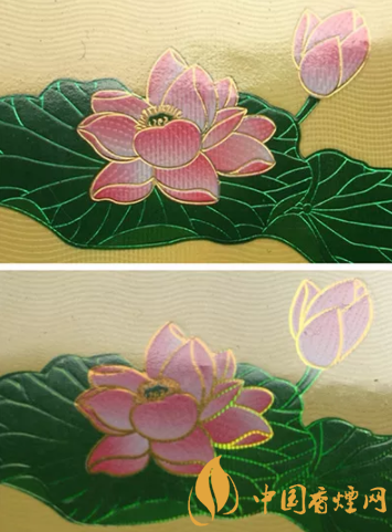 真品卷煙商標(biāo)紙上的荷花花瓣采用漸變技術(shù),顏色由粉紅色向白色過(guò)渡,花蕊處金色線(xiàn)條清晰,圖案印刷自然協(xié)調(diào),立體感強(qiáng);假煙采用普通仿制技術(shù),顏色搭配較為死板,花蕊處金色線(xiàn)條模糊、擠成一團(tuán),圖案印刷粗糙、立體感差。