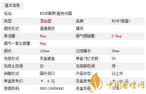 ESSE是韓國(guó)產(chǎn)的一種女式香煙,它的中文名為愛(ài)喜 。這個(gè)煙是韓國(guó)煙草人參公社出品,它的全稱(chēng)為ESSE Menthol,也叫愛(ài)易,愛(ài)惜。它有粉色普通型、藍(lán)色特醇型和綠色薄荷型,是極有女人緣的韓國(guó)煙,薄荷味入口清涼,比較經(jīng)典的涼煙。