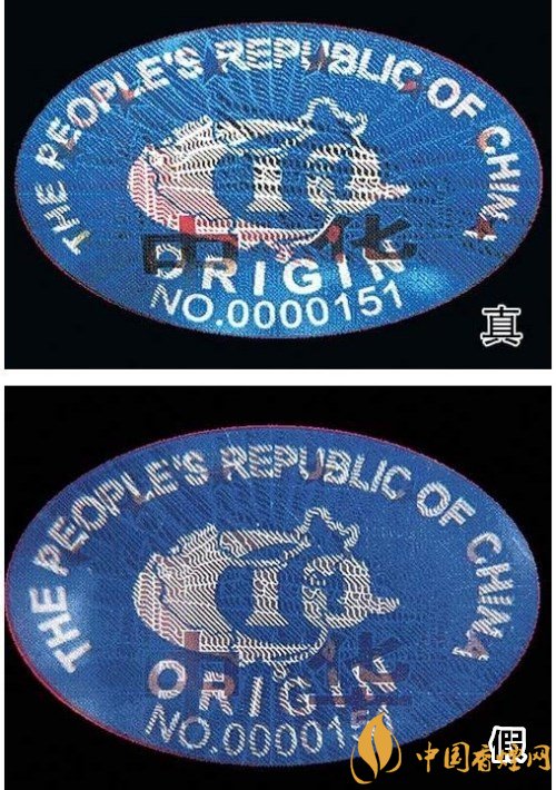 3、“中華”原產(chǎn)地標(biāo)志為藍(lán)色橢圓形,折光可見“中華”字樣、8顆“★”及天安門圖案。真煙色彩飽滿,圖案清晰;假煙色彩暗淡,圖案模糊。