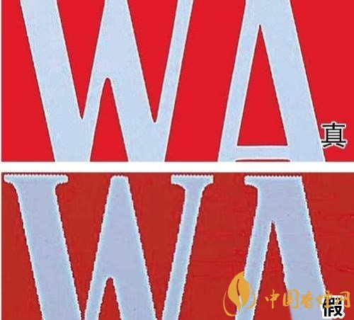 4、真煙白色字體邊緣規(guī)整光滑,字跡飽滿;假煙白色字體邊緣粗糙,色彩污濁,有明顯鋸齒印。