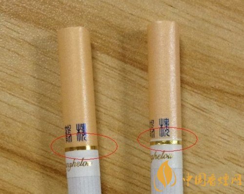 左邊真煙金色圓圈部位與煙嘴結(jié)合比較完美,毫無(wú)縫隙,而且色澤靚麗印刷不拖泥帶水,細(xì)看右邊的金色圓圈與煙嘴結(jié)合空隙較大,中間居然脫節(jié)了。而且光圈也比較粗糙。