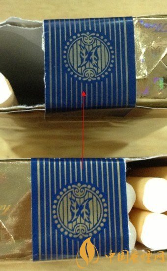 下面的真煙藍(lán)色部位顏色光鮮,有色澤,而上面的假煙略顯暗淡。從中間的圓圈部位不難分辨出來(lái)。