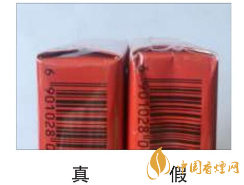 小盒正面商標(biāo)印刷工藝對(duì)比:真煙“囍”字體邊緣非鋸齒狀;假煙“囍”字體邊緣鋸齒狀。