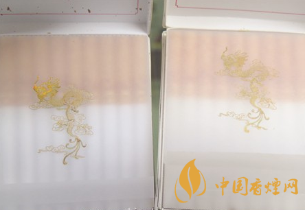 小盒商標印刷工藝差異對比:真品小盒正面套印定位燙金“飛龍”圖案鱗片清晰,從頭至尾都能看到定位燙金工藝,紅色貫穿整個龍身,“鱗片”是雪里透紅,栩栩如生;假煙套印定位燙金仿制較差,鱗片無法達到真品的印刷工藝水平,印刷工藝與真品商標圖案差異明顯。