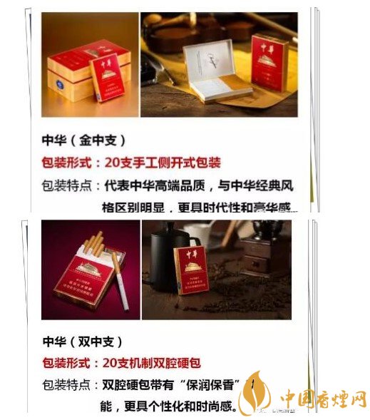 中華(金中支)采用的是20支手工側(cè)開式包裝;中華(雙中支)采用的是20支雙鋁包硬盒翻蓋式,帶有“保潤保香”功能。中華“中支”產(chǎn)品系列包裝區(qū)別與共性特色相同,形式有別功能各異。