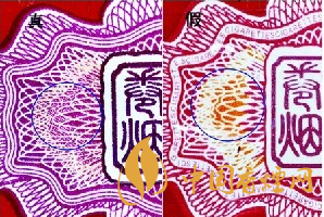 如圖所示:“蘇煙”的封簽采用“鈔細線”防偽印刷,真煙的線條清晰,色彩濃厚,印刷精細;假煙的線條模糊,色彩清淡,印刷粗糙。