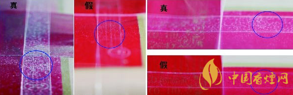 如圖所示:“蘇煙”的拉線采用特殊的工藝,真煙的拉線上面有很明顯的“麻點”,我們通常叫做“氣泡”;假煙的拉線上面沒有“氣泡”。