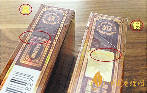 假冒:非常粗糙,方向錯位,位于煙盒的左側(cè)。